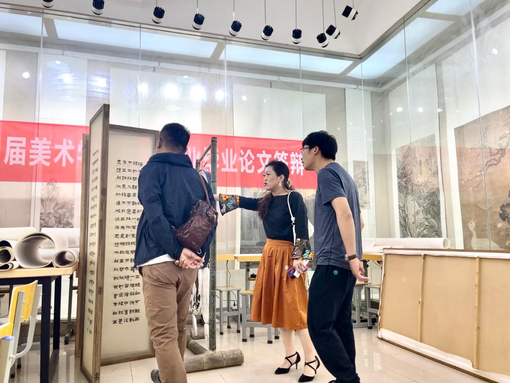 在我院领导的陪同下,吉林师范大学师生首先参观了安阳师范学院汉字文化体验馆,师生体验了刻甲骨、做拓片等活动。随后抵达了美术学院展厅,参观安阳师范学院美术学院甲骨文书法与文创展。赵涛为吉林师范大学师生详细介绍了我校美术学院作为河南省首批中华优秀传统文化传承基地在“活化甲骨文,传承冷门绝学”中做出的努力与贡献。吉林师范学院师生表示,安阳作为文字的发源地、安阳师范学院书法专业以甲骨文书法艺术作为专业特色,突出地域优势,让书法系老师、学生受益匪浅。他山之石,可以攻玉。在未来的学科建设中多借鉴安阳师范学院书法专业的经验,找准自身专业特色。