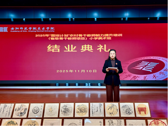 11月10日14时30分,我院2025年“国培计划”农村骨干教师能力提升培训(省级骨干教师项目)小学美术班结业典礼暨作品汇报展在锦江之星一楼会议厅隆重举行。活动由我院国画系主任、学科班主任吴柯老师与生活班主任李朝阳老师联袂主持,来自全省各地的50名小学美术骨干教师齐聚一堂,共同见证培训成果、开启美育新篇。