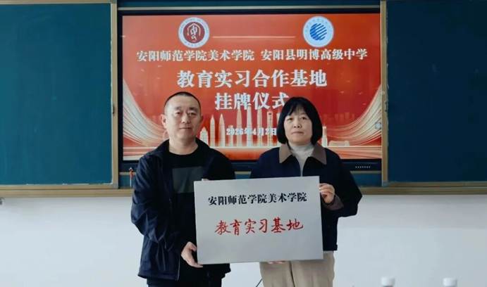 安阳县明博高级中学李梅英校长对美术学院领导一行的到来表示热烈欢迎,并详细介绍了学校基本情况、办学特色、美术专业发展现状及人才培养情况,表态将全力做好实习指导工作,为师范生提供广阔的实践平台。郭昊院长介绍了安阳师范学院美术学院的历史、学科建设情况、人才培养特色、毕业生就业情况等。双方就实习生工作展开了深入讨论,并达成共识,双方将以实习基地为依托,深化资源共享和教研共进,携手培育更多优秀美术教育人才,共促美术教育事业高质量发展。随后,双方举行了实习基地签约仪式,签订了《实习基地协议书》,并授予实习学校教育实习基地牌匾。